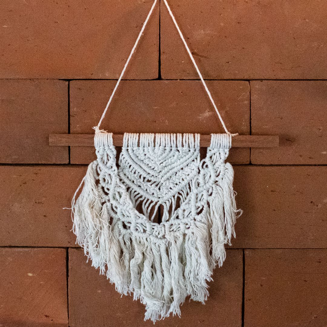Macramê com barbante cru, feito à mão pela artesã Carla Andrande.