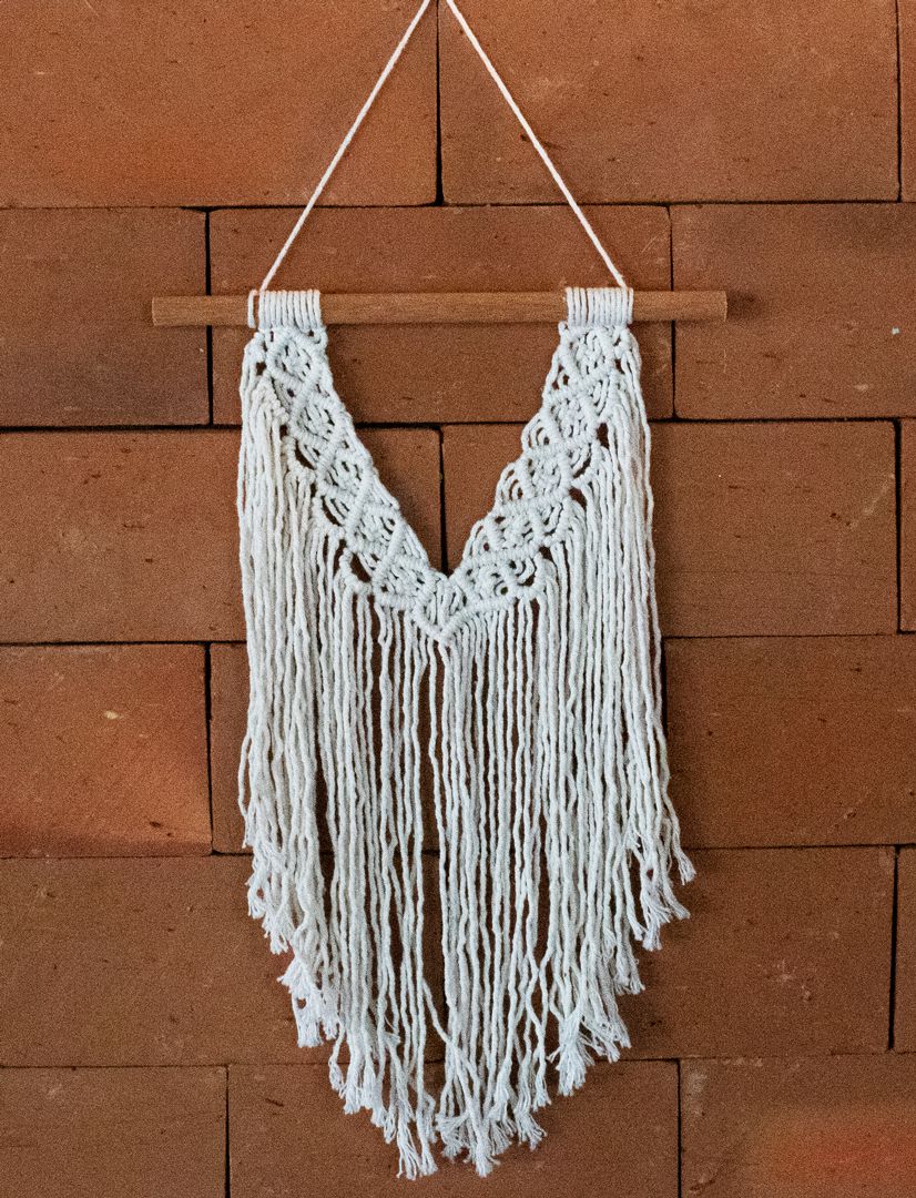 Macramê em barbante cru, feito à mão pela artesã Carla Andrande.