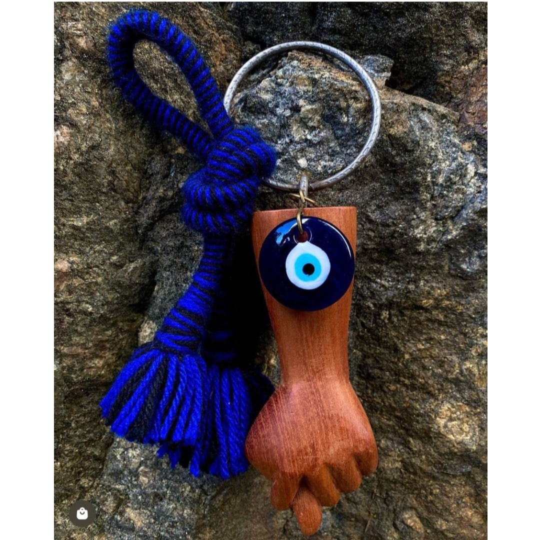 Pendente Figa com Olho Grego, figa em madeira de reflorestamento esculpida e pintada à mão, olho grego em murano. Produto 100% artesanal, criação da Artesã Rose Siqueira.