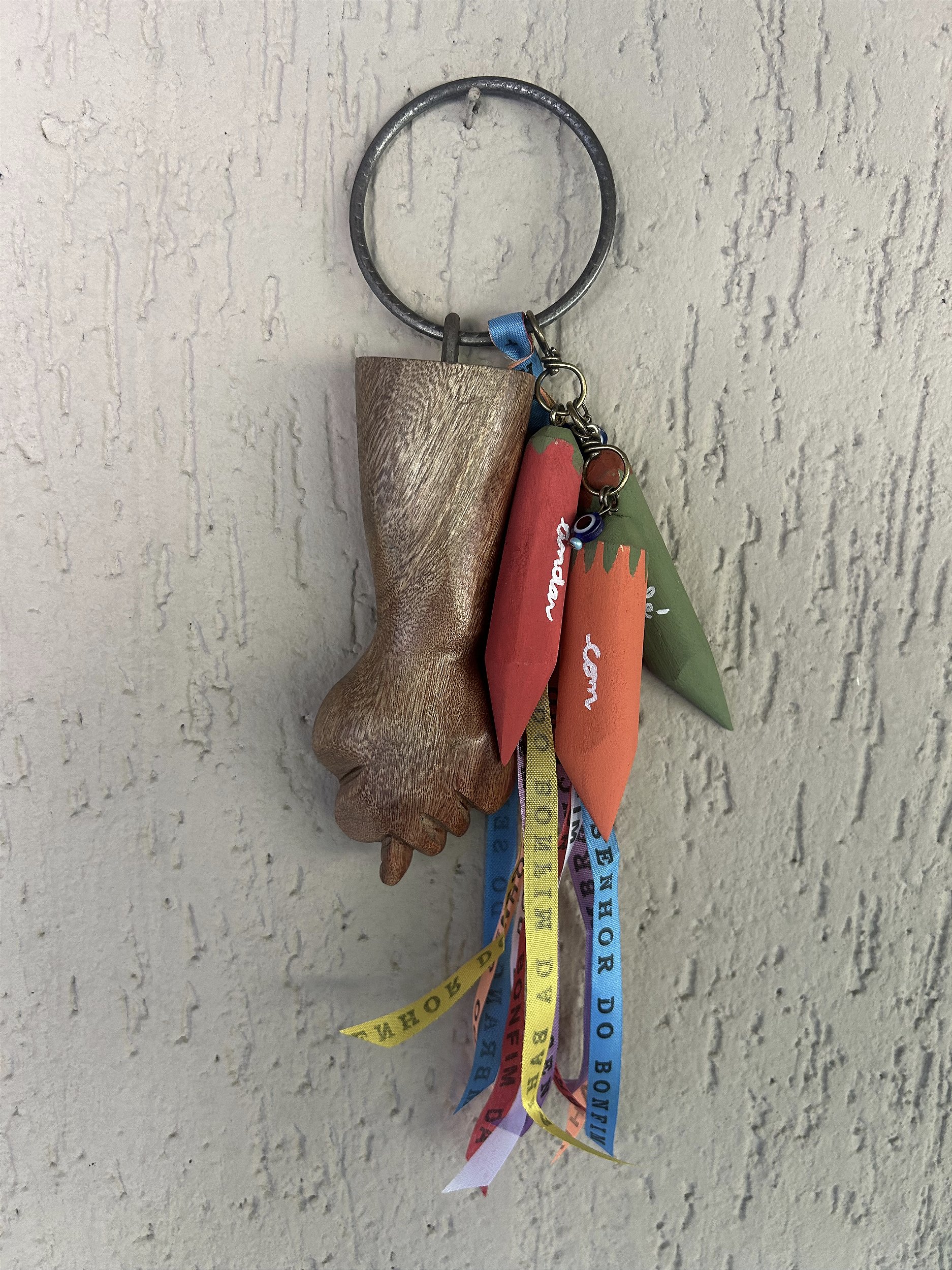 Pendente decorativo de parede/porta feito de madeira, fitilhos de bonfim e metal.