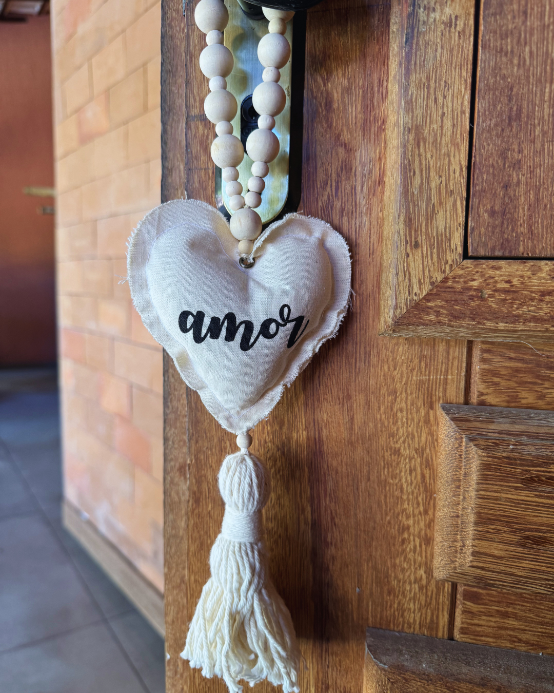 Material: Contas de madeira, coração e tassel no algodão cru.