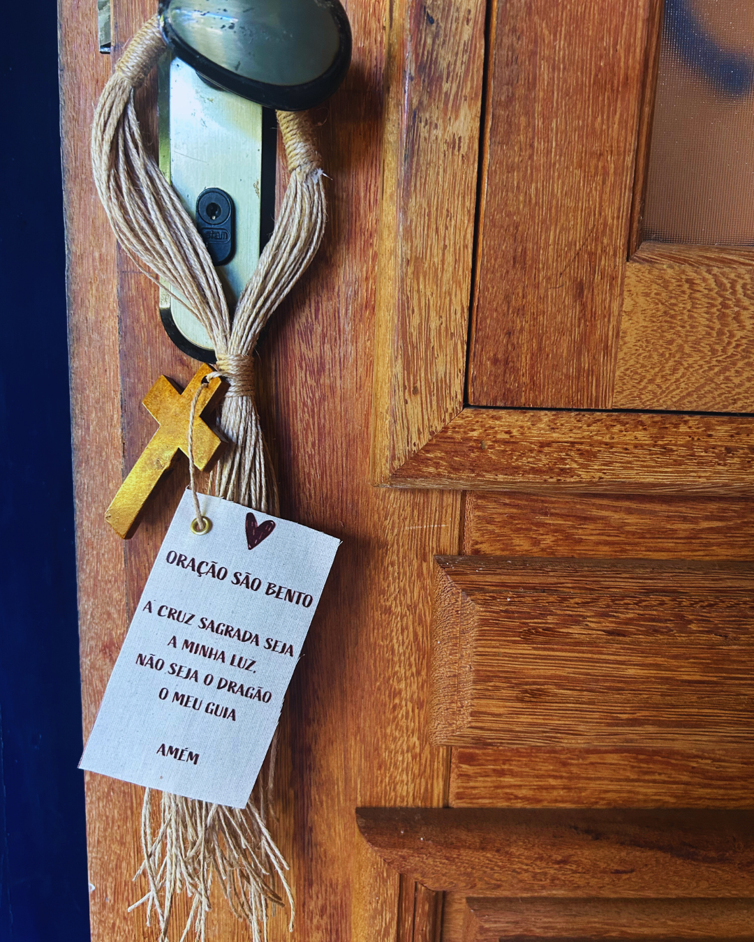 Pingente feito em rami, cruz em madeira, tecido algodão.