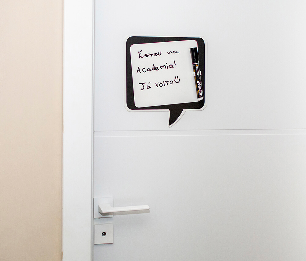 Para escrever e apagar: recados, lembretes, avisos e decorar o quarto. Acompanha a caneta de quadro branco com suporte de ímã. Para fixar em paredes, portas, acompanha fita dupla-face para a fixação. Com o uso a caneta escreve apaga poderá deixar a superfície da peça manchada. Produto de aço fabricado no Brasil. A Coleção Anote Aí é inspirada na necessidade que temos de nos expressar através de desenhos, lembretes, recados, de fazer anotações de algo que deve ser feito, que não pode cair no esquecimento, de uma forma prática e funcional.